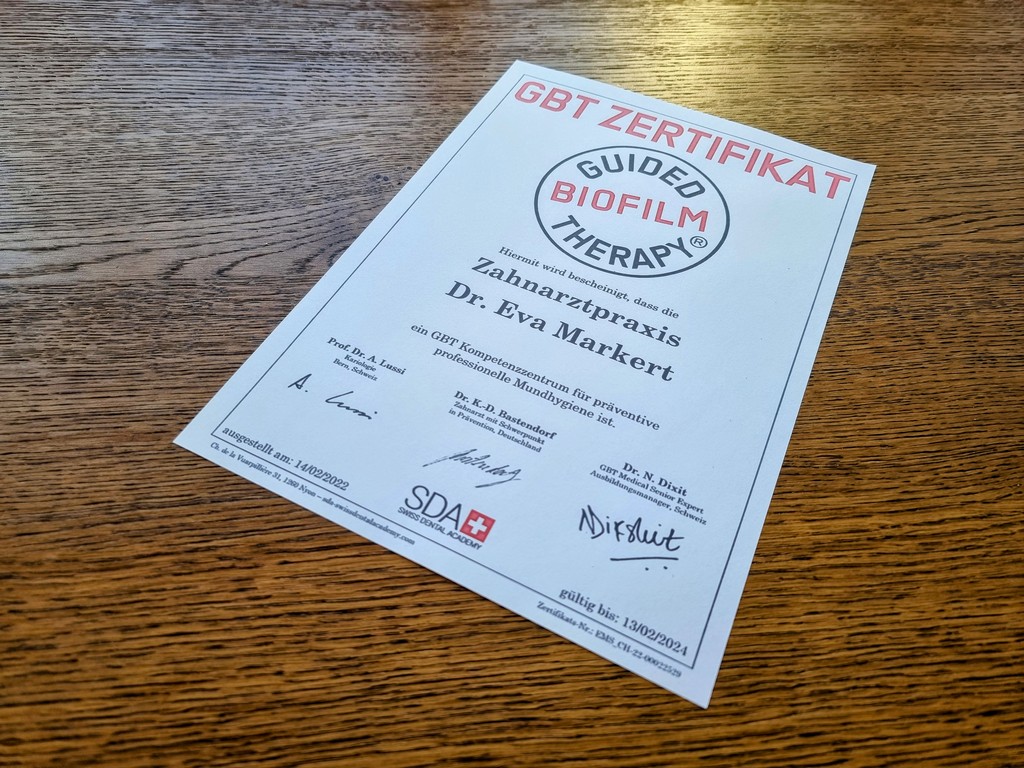 Die Praxis Zahnmedizin Schwabing Dr. Eva Markert wurde kürzlich zum GBT Kompetenzzentrum für präventive professionelle Mundhygiene zertifiziert!
